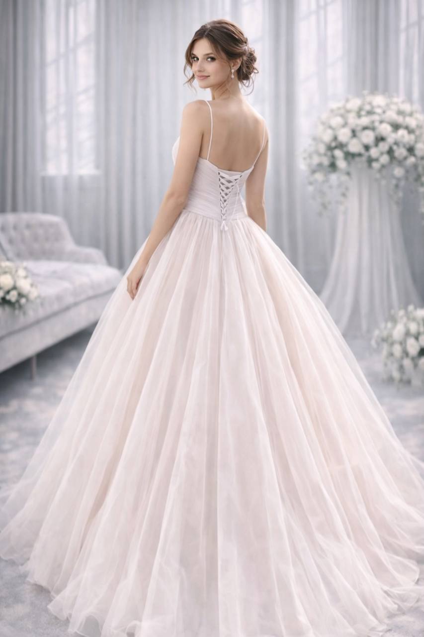 "Agata" - виняткове захоплення кольору чайної троянди. Чарівний відтінок та ніжне мереживо створюють неповторний образ. Відчуйте себе прекрасною та витонченою нареченою, втіливши свою мрію про романтичний весільний день у цьому унікальному вбранні.